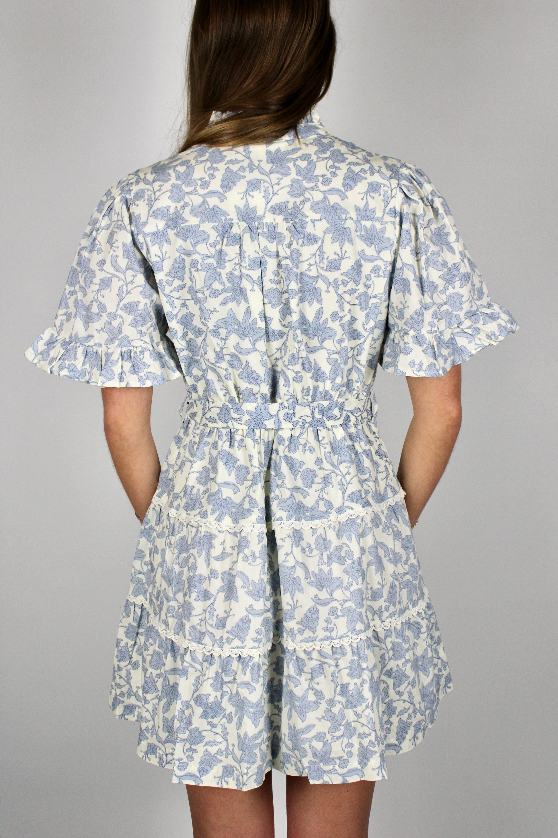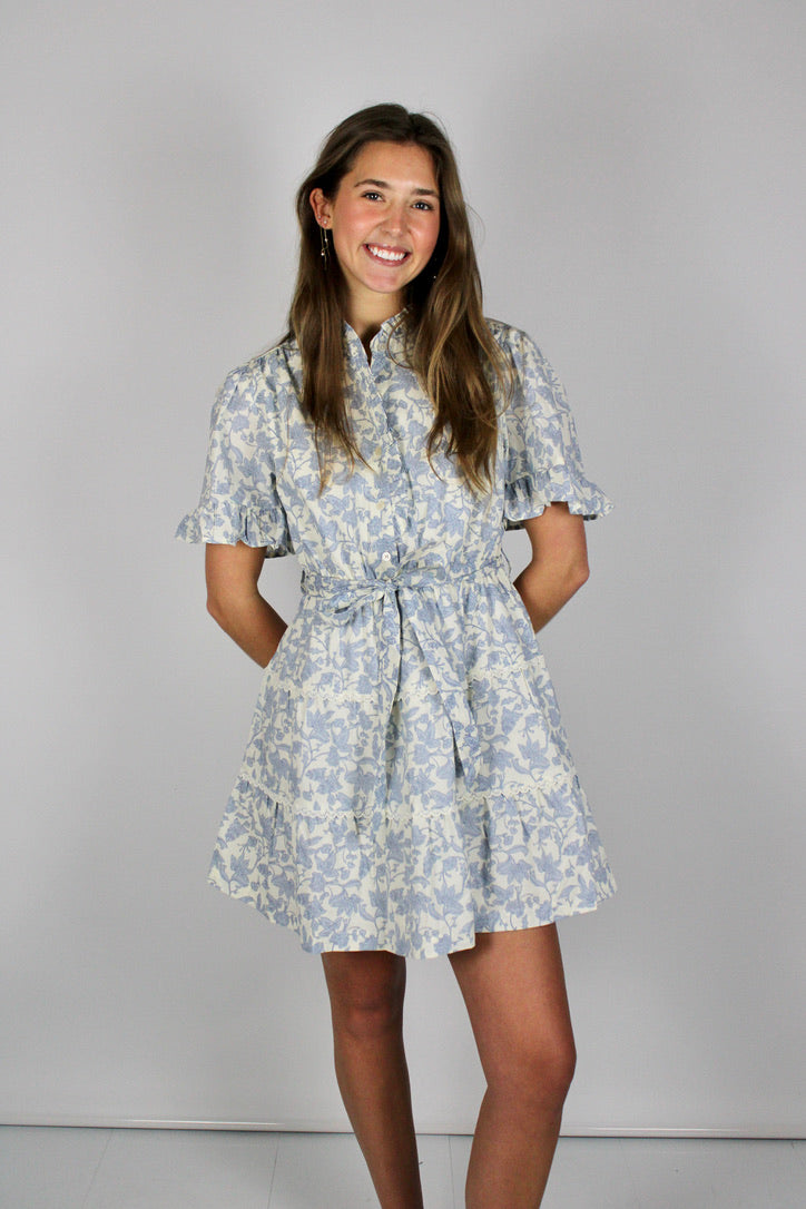 This button up mini dress has the sweetest scallop lace trim and ruffle details! The flattering self-tie waist belt and ruffle stand collar make it the perfect spring dress. Gabby is 5'8 wearing a small.